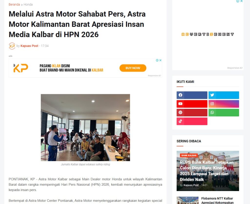 Melalui Astra Motor Sahabat Pers, Astra Motor Kalimantan Barat Apresiasi Insan Media Kalbar di HPN 2026 by Muhammad Arif 17 Februari 2026 in Silahkan kunjungi https://www.kapuaspost.web.id/2026/02/melalui-astra-motor-sahabat-pers-astra.html. Tags: astra Astra Motor kalbar Astra Motor Pontianak astramotor honda kalbar pontianak sepeda motor You Might Like Regional Public Launching New ADV160 The SUV Pride Grand Launching New PCX 160 Truly Exceptional! Tetap hati-hati ya bro sist berkendara saat hujan.
