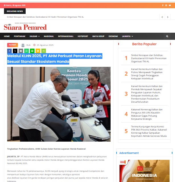 Melalui KLHN 2025, PT AHM Perkuat Peran Layanan Sesuai Standar Ekosistem Honda by masmul 25 Agustus 2025 in Silahkan kunjungi https://www.suarapemredkalbar.com/read/potret/25082025/melalui-klhn-2025-pt-ahm-perkuat-peran-layanan-sesuai-standar-ekosistem-honda. You Might Like Regional Public Launching New ADV160 The SUV Pride Grand Launching New PCX 160 Truly Exceptional! Tetap hati-hati ya bro sist berkendara saat hujan.