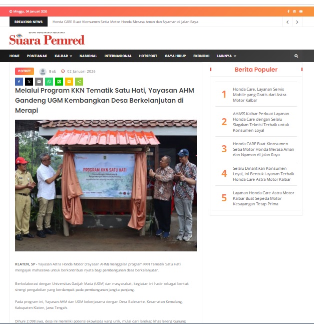 Melalui Program KKN Tematik Satu Hati, Yayasan AHM Gandeng UGM Kembangkan Desa Berkelanjutan di Merapi by masmul 2 Januari 2026 in Silahkan kunjungi https://www.suarapemredkalbar.com/read/potret/02012026/melalui-program-kkn-tematik-satu-hati-yayasan-ahm-gandeng-ugm-kembangkan-desa-berkelanjutan-di-merapi. You Might Like Regional Public Launching New ADV160 The SUV Pride Grand Launching New PCX 160 Truly Exceptional! Tetap hati-hati ya bro sist berkendara saat hujan.