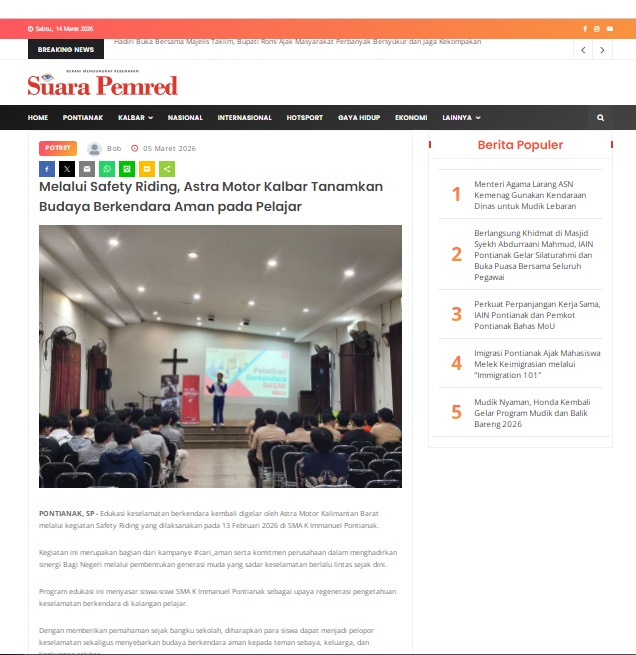 Melalui Safety Riding, Astra Motor Kalbar Tanamkan Budaya Berkendara Aman pada Pelajar by masmul 5 Maret 2026 in Silahkan kunjungi https://www.suarapemredkalbar.com/read/potret/05032026/melalui-safety-riding-astra-motor-kalbar-tanamkan-budaya-berkendara-aman-pada-pelajar. You Might Like Regional Public Launching New ADV160 The SUV Pride Grand Launching New PCX 160 Truly Exceptional! Tetap hati-hati ya bro sist berkendara saat hujan.