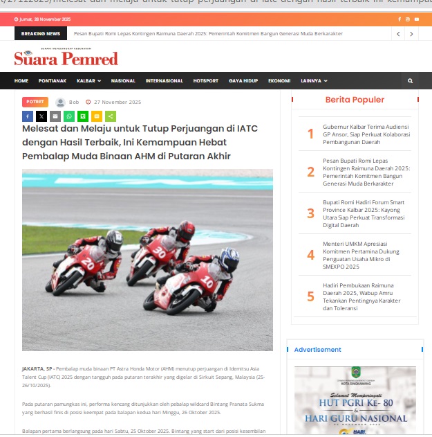 Melesat dan Melaju untuk Tutup Perjuangan di IATC dengan Hasil Terbaik, Ini Kemampuan Hebat Pembalap Muda Binaan AHM di Putaran Akhir by masmul 28 November 2025 in Silahkan kunjungi https://www.suarapemredkalbar.com/read/potret/27112025/melesat-dan-melaju-untuk-tutup-perjuangan-di-iatc-dengan-hasil-terbaik-ini-kemampuan-hebat-pembalap-muda-binaan-ahm-di-putaran-akhir. You Might Like Regional Public Launching New ADV160 The SUV Pride Grand Launching New PCX 160 Truly Exceptional! Tetap hati-hati ya bro sist berkendara saat hujan.
