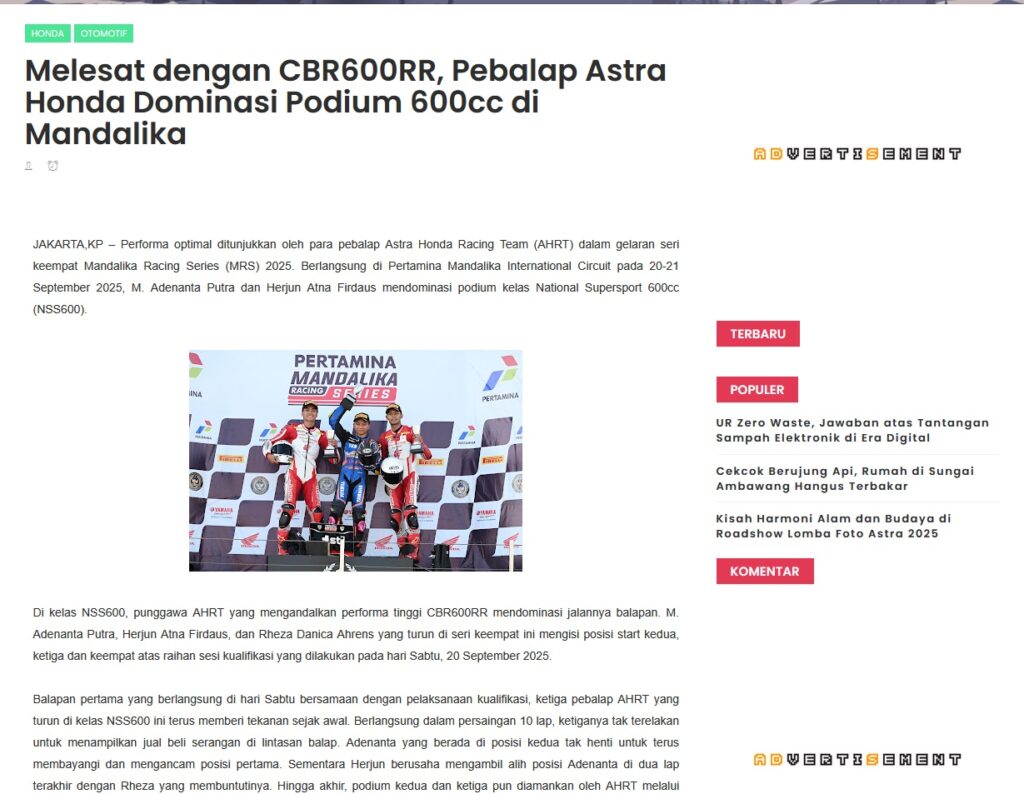 Melesat dengan CBR600RR, Pebalap Astra Honda Dominasi Podium 600cc di Mandalika by Muhammad Arif 23 September 2025 in Silahkan kunjungi https://www.kapuaspost.web.id/2025/09/melesat-dengan-cbr600rr-pebalap-astra.html. Tags: astra Astra Motor kalbar Astra Motor Pontianak astramotor honda kalbar pontianak sepeda motor You Might Like Regional Public Launching New ADV160 The SUV Pride Grand Launching New PCX 160 Truly Exceptional! Tetap hati-hati ya bro sist berkendara saat hujan.
