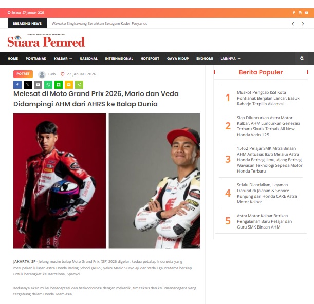 Melesat di Moto Grand Prix 2026, Mario dan Veda Didampingi AHM dari AHRS ke Balap Dunia by masmul 22 Januari 2026 in Silahkan kunjungi https://www.suarapemredkalbar.com/read/potret/22012026/melesat-di-moto-grand-prix-2026-mario-dan-veda-didampingi-ahm-dari-ahrs-ke-balap-dunia. You Might Like Regional Public Launching New ADV160 The SUV Pride Grand Launching New PCX 160 Truly Exceptional! Tetap hati-hati ya bro sist berkendara saat hujan.