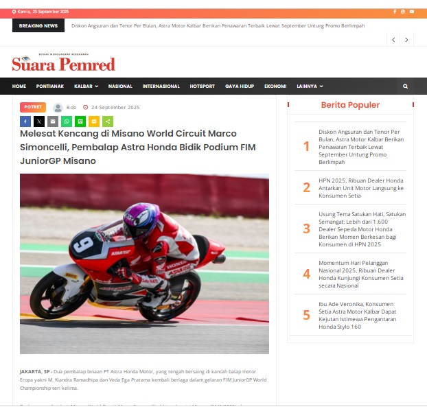 Melesat Kencang di Misano World Circuit Marco Simoncelli, Pembalap Astra Honda Bidik Podium FIM JuniorGP Misano by masmul 24 September 2025 in Silahkan kunjungi https://www.suarapemredkalbar.com/read/potret/24092025/melesat-kencang-di-misano-world-circuit-marco-simoncelli-pembalap-astra-honda-bidik-podium-fim-juniorgp-misano. You Might Like Regional Public Launching New ADV160 The SUV Pride Grand Launching New PCX 160 Truly Exceptional! Tetap hati-hati ya bro sist berkendara saat hujan.