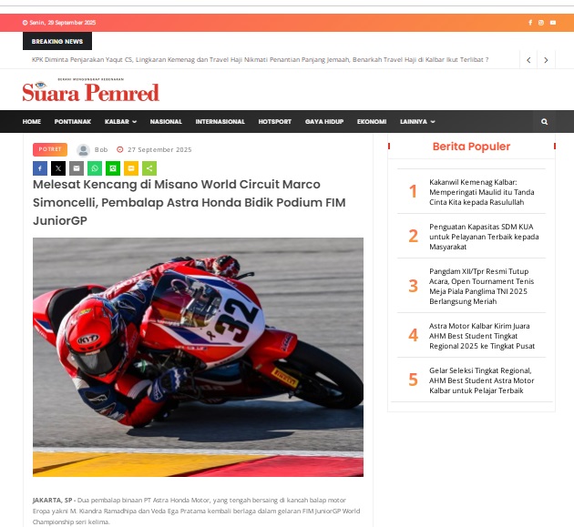 Melesat Kencang di Misano World Circuit Marco Simoncelli, Pembalap Astra Honda Bidik Podium FIM JuniorGP by masmul 27 September 2025 in Silahkan kunjungi https://www.suarapemredkalbar.com/read/potret/27092025/melesat-kencang-di-misano-world-circuit-marco-simoncelli-pembalap-astra-honda-bidik-podium-fim-juniorgp. You Might Like Regional Public Launching New ADV160 The SUV Pride Grand Launching New PCX 160 Truly Exceptional! Tetap hati-hati ya bro sist berkendara saat hujan.
