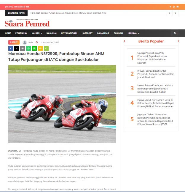 Memacu Honda NSF250R, Pembalap Binaan AHM Tutup Perjuangan di IATC dengan Spektakuler by masmul 11 November 2025 in Silahkan kunjungi https://www.suarapemredkalbar.com/read/potret/11112025/memacu-honda-nsf250r-pembalap-binaan-ahm-tutup-perjuangan-di-iatc-dengan-spektakuler. You Might Like Regional Public Launching New ADV160 The SUV Pride Grand Launching New PCX 160 Truly Exceptional! Tetap hati-hati ya bro sist berkendara saat hujan.