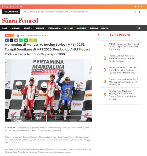 Membalap di Mandalika Racing Series (MRS) 2025, Tampil Gemilang di MRS 2025, Pembalap AHRT Kuasai Podium Kelas National Supersport600 by masmul 8 November 2025 in Silahkan kunjungi https://www.suarapemredkalbar.com/read/potret/08112025/membalap-di-mandalika-racing-series-mrs-2025-tampil-gemilang-di-mrs-2025-pembalap-ahrt-kuasai-podium-kelas-national-supersport600. You Might Like Regional Public Launching New ADV160 The SUV Pride Grand Launching New PCX 160 Truly Exceptional! Tetap hati-hati ya bro sist berkendara saat hujan.