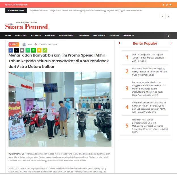 Menarik dan Banyak Diskon, Ini Promo Spesial Akhir Tahun kepada seluruh masyarakat di Kota Pontianak dari Astra Motoro Kalbar by masmul 21 Desember 2025 in Silahkan kunjungi https://www.suarapemredkalbar.com/read/potret/21122025/menarik-dan-banyak-diskon-ini-promo-spesial-akhir-tahun-kepada-seluruh-masyarakat-di-kota-pontianak-dari-astra-motoro-kalbar. You Might Like Regional Public Launching New ADV160 The SUV Pride Grand Launching New PCX 160 Truly Exceptional! Tetap hati-hati ya bro sist berkendara saat hujan.