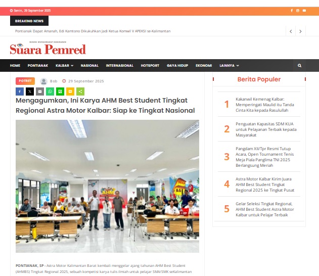 Mengagumkan, Ini Karya AHM Best Student Tingkat Regional Astra Motor Kalbar: Siap ke Tingkat Nasional by masmul 29 September 2025 in Silahkan kunjungi https://www.suarapemredkalbar.com/read/potret/29092025/mengagumkan-ini-karya-ahm-best-student-tingkat-regional-astra-motor-kalbar-siap-ke-tingkat-nasional. You Might Like Regional Public Launching New ADV160 The SUV Pride Grand Launching New PCX 160 Truly Exceptional! Tetap hati-hati ya bro sist berkendara saat hujan.