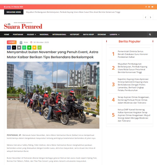 Menyambut bulan November yang Penuh Event, Astra Motor Kalbar Berikan Tips Berkendara Berkelompok by masmul 30 Oktober 2025 in Silahkan kunjungi https://www.suarapemredkalbar.com/read/potret/30102025/menyambut-bulan-november-yang-penuh-event-astra-motor-kalbar-berikan-tips-berkendara-berkelompok. You Might Like Regional Public Launching New ADV160 The SUV Pride Grand Launching New PCX 160 Truly Exceptional! Tetap hati-hati ya bro sist berkendara saat hujan.