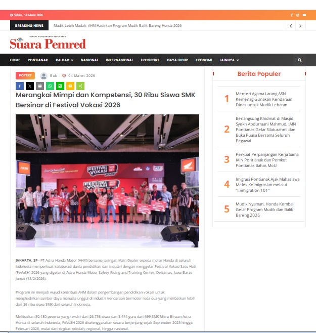 Merangkai Mimpi dan Kompetensi, 30 Ribu Siswa SMK Bersinar di Festival Vokasi 2026 by masmul 4 Maret 2026 in Silahkan kunjungi https://www.suarapemredkalbar.com/read/potret/04032026/merangkai-mimpi-dan-kompetensi-30-ribu-siswa-smk-bersinar-di-festival-vokasi-2026. You Might Like Regional Public Launching New ADV160 The SUV Pride Grand Launching New PCX 160 Truly Exceptional! Tetap hati-hati ya bro sist berkendara saat hujan.