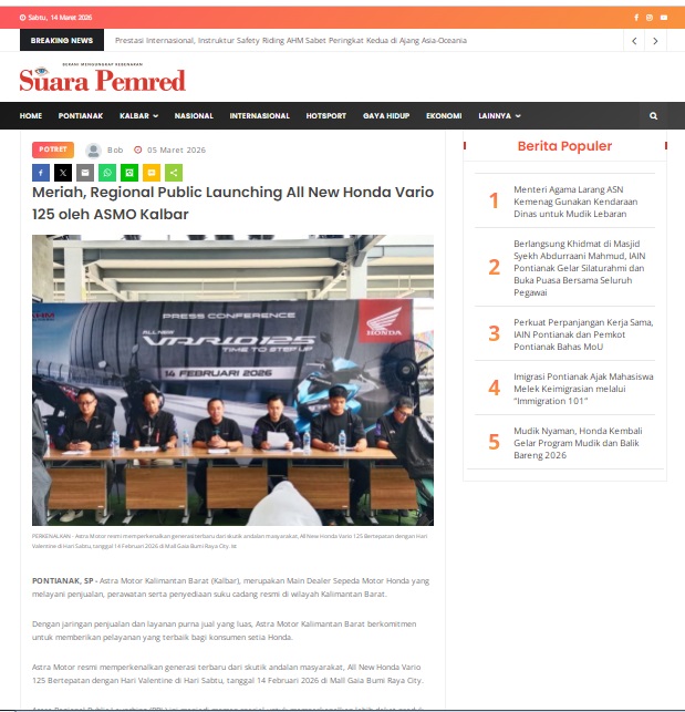 Meriah, Regional Public Launching All New Honda Vario 125 oleh ASMO Kalbar by masmul 5 Maret 2026 in Silahkan kunjungi https://www.suarapemredkalbar.com/read/potret/05032026/meriah-regional-public-launching-all-new-honda-vario-125-oleh-asmo-kalbar. You Might Like Regional Public Launching New ADV160 The SUV Pride Grand Launching New PCX 160 Truly Exceptional! Tetap hati-hati ya bro sist berkendara saat hujan.