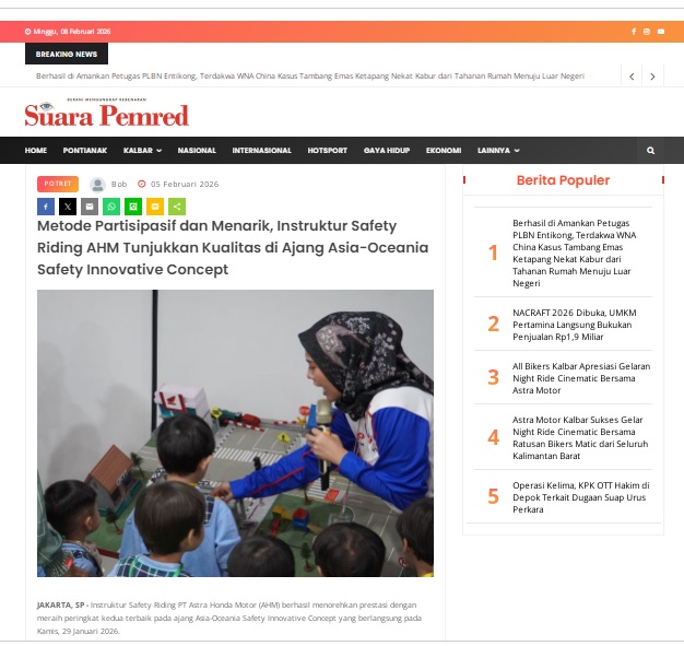 Metode Partisipasif dan Menarik, Instruktur Safety Riding AHM Tunjukkan Kualitas di Ajang Asia-Oceania Safety Innovative Concept by masmul 5 Februari 2026 in Silahkan kunjungi https://www.suarapemredkalbar.com/read/potret/05022026/metode-partisipasif-dan-menarik-instruktur-safety-riding-ahm-tunjukkan-kualitas-di-ajang-asia-oceania-safety-innovative-concept. You Might Like Regional Public Launching New ADV160 The SUV Pride Grand Launching New PCX 160 Truly Exceptional! Tetap hati-hati ya bro sist berkendara saat hujan.
