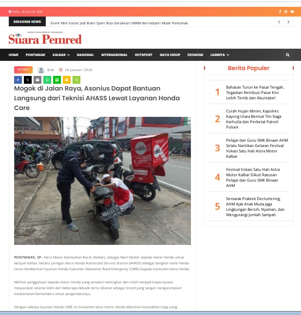 Mogok di Jalan Raya, Asonius Dapat Bantuan Langsung dari Teknisi AHASS Lewat Layanan Honda Care by masmul 24 Januari 2026 in Silahkan kunjungi https://www.suarapemredkalbar.com/read/potret/24012026/mogok-di-jalan-raya-asonius-dapat-bantuan-langsung-dari-teknisi-ahass-lewat-layanan-honda-care. You Might Like Regional Public Launching New ADV160 The SUV Pride Grand Launching New PCX 160 Truly Exceptional! Tetap hati-hati ya bro sist berkendara saat hujan.