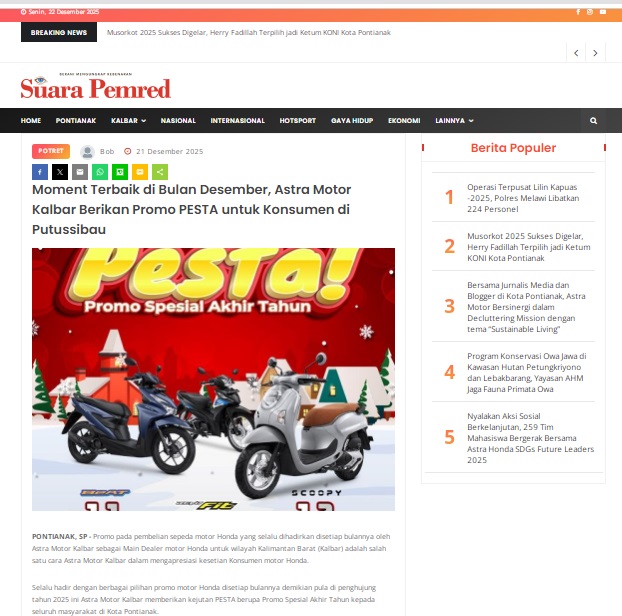 Moment Terbaik di Bulan Desember, Astra Motor Kalbar Berikan Promo PESTA untuk Konsumen di Putussibau by masmul 21 Desember 2025 in Silahkan kunjungi https://www.suarapemredkalbar.com/read/potret/21122025/moment-terbaik-di-bulan-desember-astra-motor-kalbar-berikan-promo-pesta-untuk-konsumen-di-putussibau. You Might Like Regional Public Launching New ADV160 The SUV Pride Grand Launching New PCX 160 Truly Exceptional! Tetap hati-hati ya bro sist berkendara saat hujan.