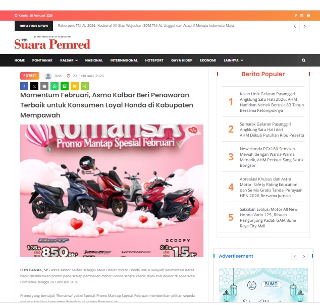 Momentum Februari, Asmo Kalbar Beri Penawaran Terbaik untuk Konsumen Loyal Honda di Kabupaten Mempawah by masmul 23 Februari 2026 in Silahkan kunjungi https://www.suarapemredkalbar.com/read/potret/23022026/momentum-februari-asmo-kalbar-beri-penawaran-terbaik-untuk-konsumen-loyal-honda-di-kabupaten-mempawah. You Might Like Regional Public Launching New ADV160 The SUV Pride Grand Launching New PCX 160 Truly Exceptional! Tetap hati-hati ya bro sist berkendara saat hujan.