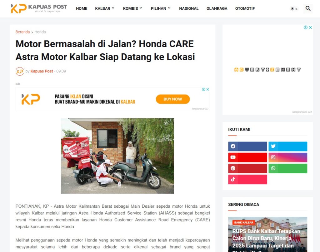 Motor Bermasalah di Jalan? Honda CARE Astra Motor Kalbar Siap Datang ke Lokasi by Muhammad Arif 8 Februari 2026 in Silahkan kunjungi https://www.kapuaspost.web.id/2026/02/motor-bermasalah-di-jalan-honda-care.html. Tags: astra Astra Motor kalbar Astra Motor Pontianak astramotor honda kalbar pontianak sepeda motor You Might Like Regional Public Launching New ADV160 The SUV Pride Grand Launching New PCX 160 Truly Exceptional! Tetap hati-hati ya bro sist berkendara saat hujan.