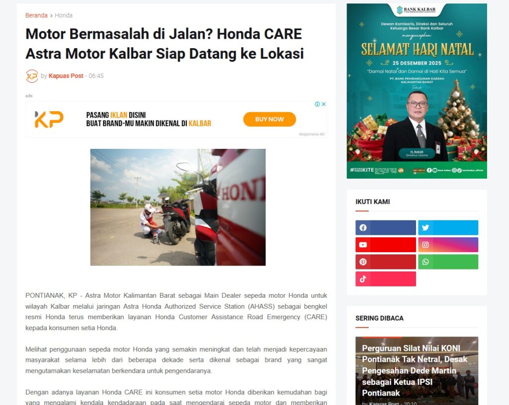 Motor Bermasalah di Jalan? Honda CARE Astra Motor Kalbar Siap Datang ke Lokasi by Muhammad Arif 28 Desember 2025 in Silahkan kunjungi https://www.kapuaspost.web.id/2025/12/motor-bermasalah-di-jalan-honda-care.html. Tags: astra Astra Motor kalbar Astra Motor Pontianak astramotor honda kalbar pontianak sepeda motor You Might Like Regional Public Launching New ADV160 The SUV Pride Grand Launching New PCX 160 Truly Exceptional! Tetap hati-hati ya bro sist berkendara saat hujan.