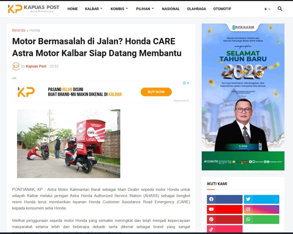 Motor Bermasalah di Jalan? Honda CARE Astra Motor Kalbar Siap Datang Membantu by Muhammad Arif 14 Januari 2026 in Silahkan kunjungi https://www.kapuaspost.web.id/2026/01/motor-bermasalah-di-jalan-honda-care_19.html. Tags: astra Astra Motor kalbar Astra Motor Pontianak astramotor honda kalbar pontianak sepeda motor You Might Like Regional Public Launching New ADV160 The SUV Pride Grand Launching New PCX 160 Truly Exceptional! Tetap hati-hati ya bro sist berkendara saat hujan.