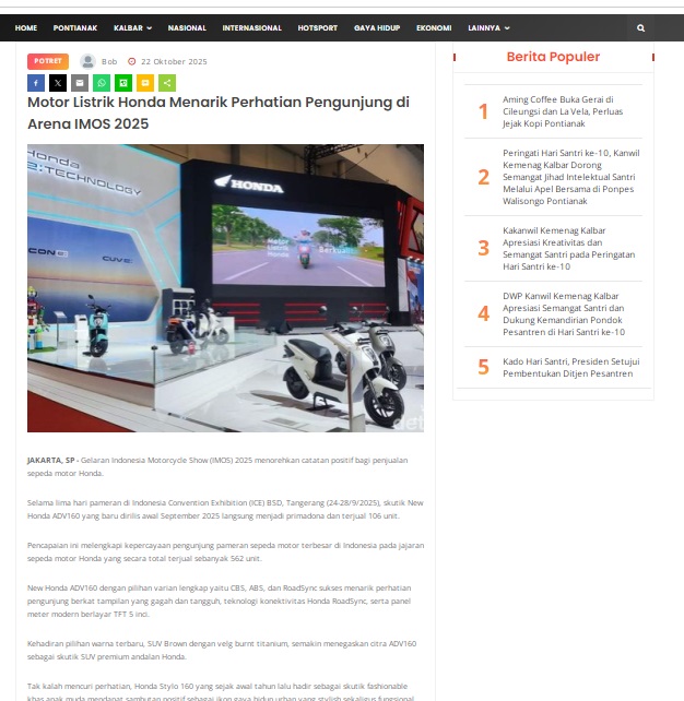 Motor Listrik Honda Menarik Perhatian Pengunjung di Arena IMOS 2025 by masmul 22 Oktober 2025 in Silahkan kunjungi https://www.suarapemredkalbar.com/read/potret/22102025/motor-listrik-honda-menarik-perhatian-pengunjung-di-arena-imos-2025. You Might Like Regional Public Launching New ADV160 The SUV Pride Grand Launching New PCX 160 Truly Exceptional! Tetap hati-hati ya bro sist berkendara saat hujan.