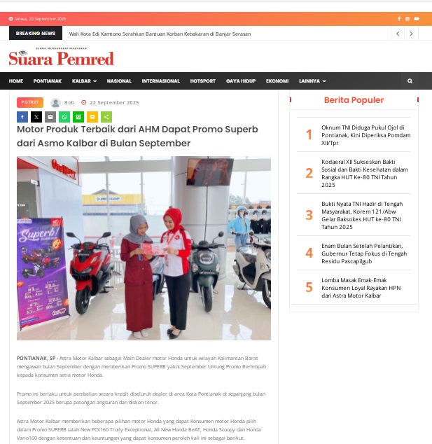 Motor Produk Terbaik dari AHM Dapat Promo Superb dari Asmo Kalbar di Bulan September by masmul 22 September 2025 in Silahkan kunjungi https://www.suarapemredkalbar.com/read/potret/22092025/motor-produk-terbaik-dari-ahm-dapat-promo-superb-dari-asmo-kalbar-di-bulan-september. You Might Like Regional Public Launching New ADV160 The SUV Pride Grand Launching New PCX 160 Truly Exceptional! Tetap hati-hati ya bro sist berkendara saat hujan.