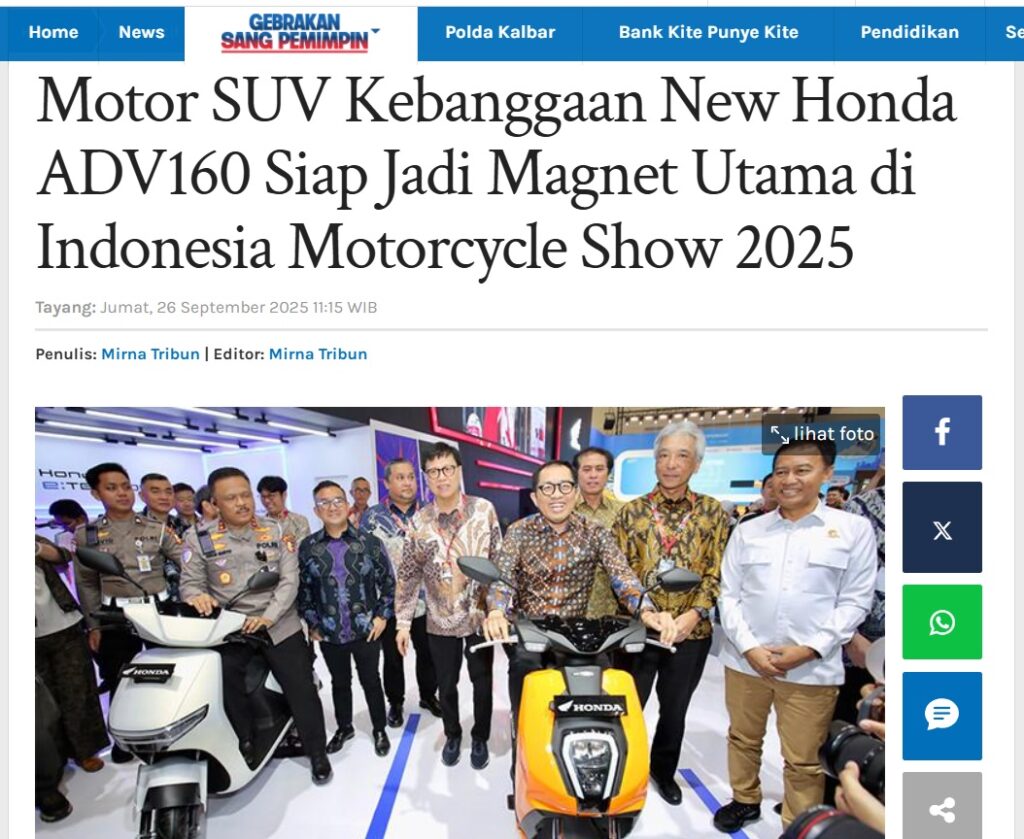 Motor SUV Kebanggaan New Honda ADV160 Siap Jadi Magnet Utama di Indonesia Motorcycle Show 2025 by Ishak Ismail 26 September 2025 in Silahkan kunjungi https://pontianak.tribunnews.com/otomotif/1142992/motor-suv-kebanggaan-new-honda-adv160-siap-jadi-magnet-utama-di-indonesia-motorcycle-show-2025. You Might Like Regional Public Launching New ADV160 The SUV Pride Grand Launching New PCX 160 Truly Exceptional! Tetap hati-hati ya bro sist berkendara saat hujan.