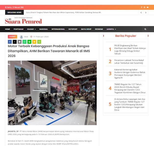 Motor Terbaik Kebanggaan Produksi Anak Bangsa Ditampilkan, AHM Berikan Tawaran Menarik di IIMS 2026 by masmul 11 Februari 2026 in Silahkan kunjungi https://www.suarapemredkalbar.com/read/potret/11022026/motor-terbaik-kebanggaan-produksi-anak-bangsa-ditampilkan-ahm-berikan-tawaran-menarik-di-iims-2026. You Might Like Regional Public Launching New ADV160 The SUV Pride Grand Launching New PCX 160 Truly Exceptional! Tetap hati-hati ya bro sist berkendara saat hujan.
