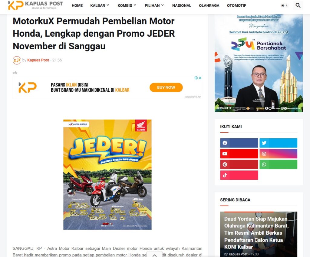 MotorkuX Permudah Pembelian Motor Honda, Lengkap dengan Promo JEDER November di Sanggau by Muhammad Arif 15 November 2025 in Silahkan kunjungi https://www.kapuaspost.web.id/2025/11/motorkux-permudah-pembelian-motor-honda.html. Tags: astra Astra Motor kalbar Astra Motor Pontianak astramotor honda kalbar pontianak sepeda motor You Might Like Regional Public Launching New ADV160 The SUV Pride Grand Launching New PCX 160 Truly Exceptional! Tetap hati-hati ya bro sist berkendara saat hujan.