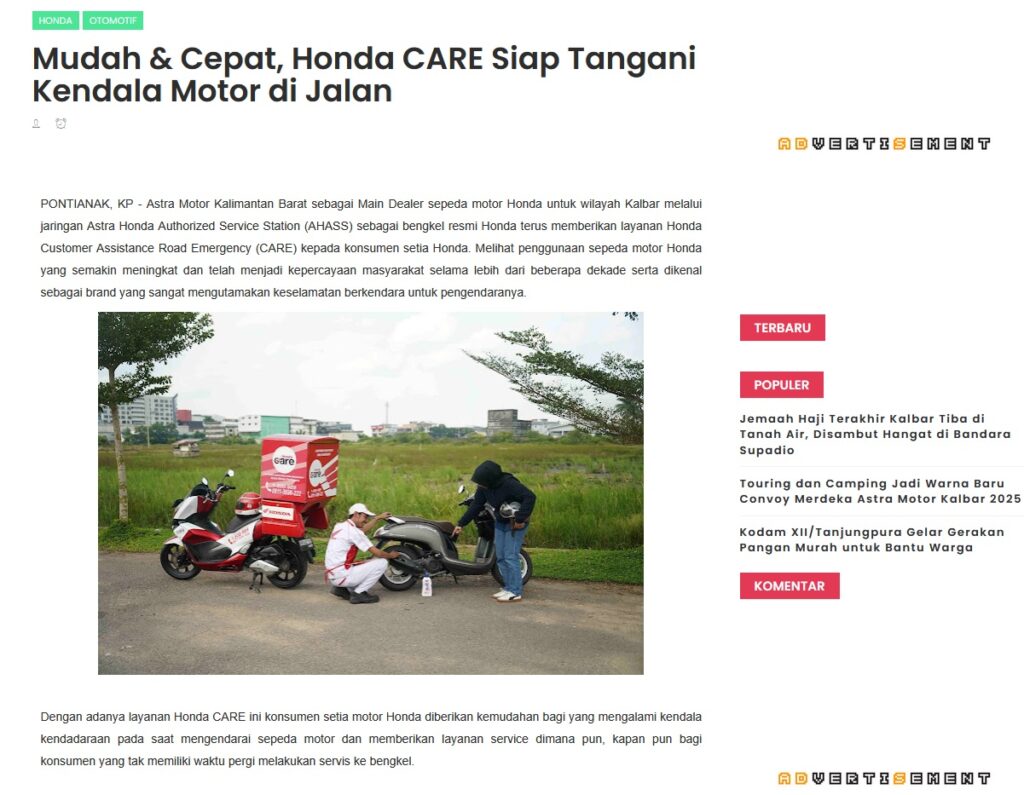 Mudah & Cepat, Honda CARE Siap Tangani Kendala Motor di Jalan by Muhammad Arif 2 September 2025 in Silahkan kunjungi https://www.kapuaspost.web.id/2025/09/mudah-cepat-honda-care-siap-tangani.html. Tags: astra Astra Motor kalbar Astra Motor Pontianak astramotor honda kalbar pontianak sepeda motor You Might Like Regional Public Launching New ADV160 The SUV Pride Grand Launching New PCX 160 Truly Exceptional! Tetap hati-hati ya bro sist berkendara saat hujan.