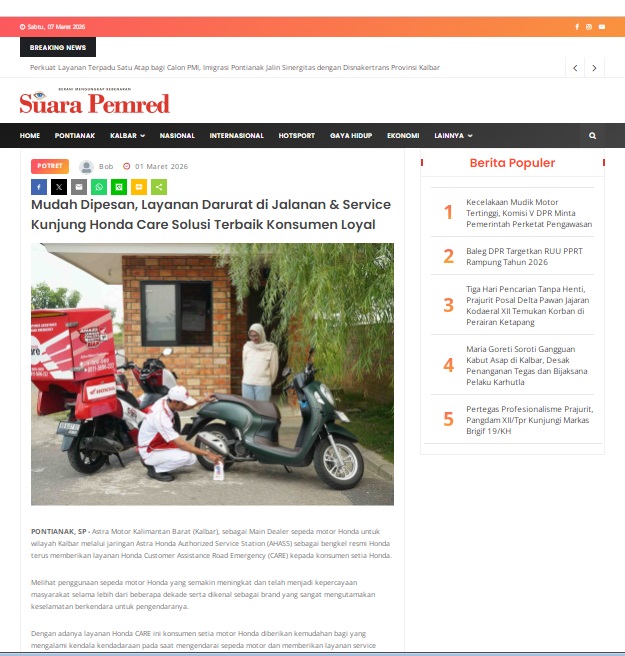 Mudah Dipesan, Layanan Darurat di Jalanan & Service Kunjung Honda Care Solusi Terbaik Konsumen Loyal by masmul 1 Maret 2026 in Silahkan kunjungi https://www.suarapemredkalbar.com/read/potret/01032026/mudah-dipesan-layanan-darurat-di-jalanan-service-kunjung-honda-care-solusi-terbaik-konsumen-loyal. You Might Like Regional Public Launching New ADV160 The SUV Pride Grand Launching New PCX 160 Truly Exceptional! Tetap hati-hati ya bro sist berkendara saat hujan.