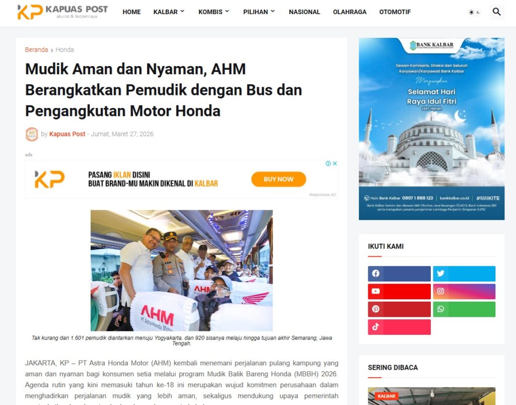 Mudik Aman dan Nyaman, AHM Berangkatkan Pemudik dengan Bus dan Pengangkutan Motor Honda by Muhammad Arif 27 Maret 2026 in Silahkan kunjungi https://www.kapuaspost.web.id/2026/03/mudik-aman-dan-nyaman-ahm-berangkatkan_29.html. Tags: astra Astra Motor kalbar Astra Motor Pontianak astramotor honda kalbar pontianak sepeda motor You Might Like Regional Public Launching New ADV160 The SUV Pride Grand Launching New PCX 160 Truly Exceptional! Tetap hati-hati ya bro sist berkendara saat hujan.