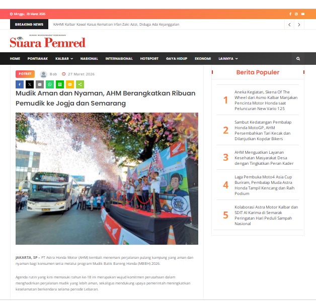 Mudik Aman dan Nyaman, AHM Berangkatkan Ribuan Pemudik ke Jogja dan Semarang by masmul 27 Maret 2026 in Silahkan kunjungi https://www.suarapemredkalbar.com/read/potret/27032026/mudik-aman-dan-nyaman-ahm-berangkatkan-ribuan-pemudik-ke-jogja-dan-semarang. You Might Like Regional Public Launching New ADV160 The SUV Pride Grand Launching New PCX 160 Truly Exceptional! Tetap hati-hati ya bro sist berkendara saat hujan.