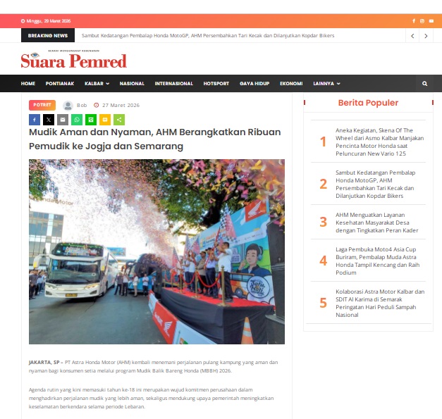 Mudik Aman dan Nyaman, AHM Berangkatkan Ribuan Pemudik ke Jogja dan Semarang by masmul 27 Maret 2026 in Silahkan kunjungi https://www.suarapemredkalbar.com/read/potret/27032026/mudik-aman-dan-nyaman-ahm-berangkatkan-ribuan-pemudik-ke-jogja-dan-semarang. You Might Like Regional Public Launching New ADV160 The SUV Pride Grand Launching New PCX 160 Truly Exceptional! Tetap hati-hati ya bro sist berkendara saat hujan.