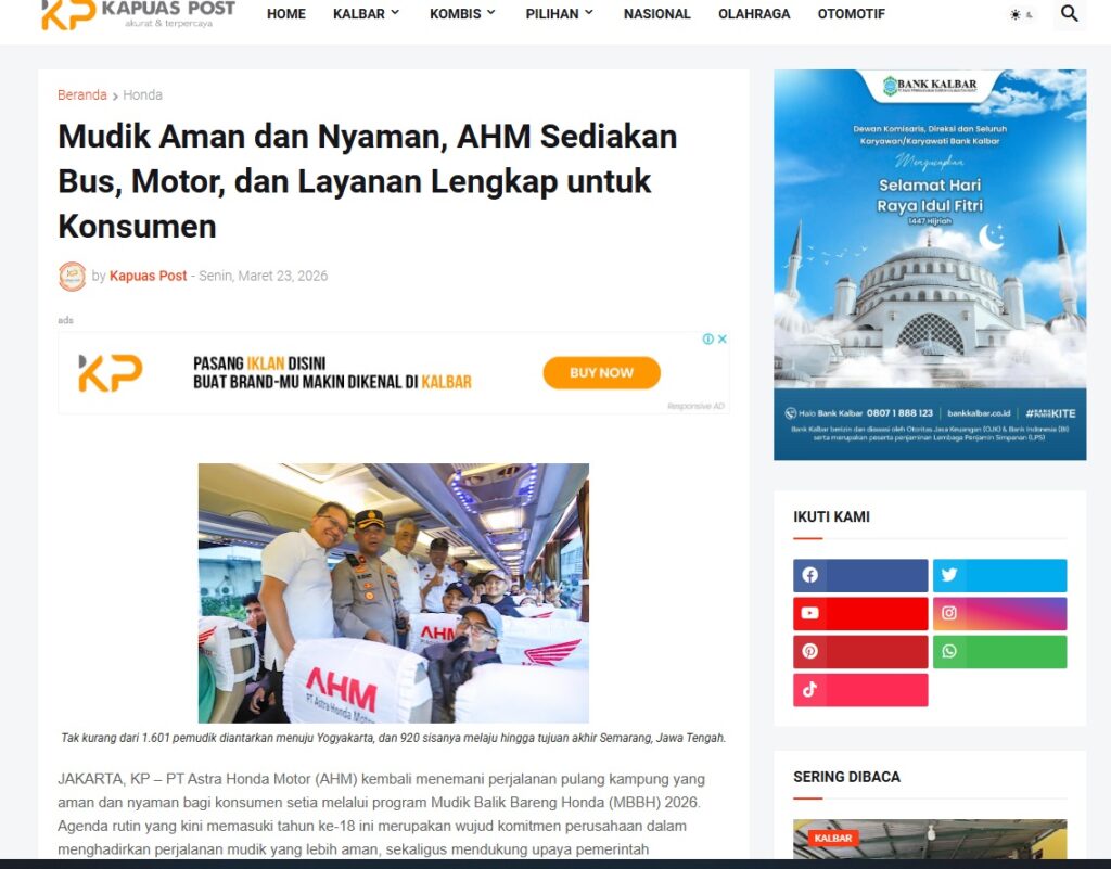 Mudik Aman dan Nyaman, AHM Sediakan Bus, Motor, dan Layanan Lengkap untuk Konsumen by Muhammad Arif 23 Maret 2026 in Silahkan kunjungi https://www.kapuaspost.web.id/2026/03/mudik-aman-dan-nyaman-ahm-sediakan-bus.html. Tags: astra Astra Motor kalbar Astra Motor Pontianak astramotor honda kalbar pontianak sepeda motor You Might Like Regional Public Launching New ADV160 The SUV Pride Grand Launching New PCX 160 Truly Exceptional! Tetap hati-hati ya bro sist berkendara saat hujan.