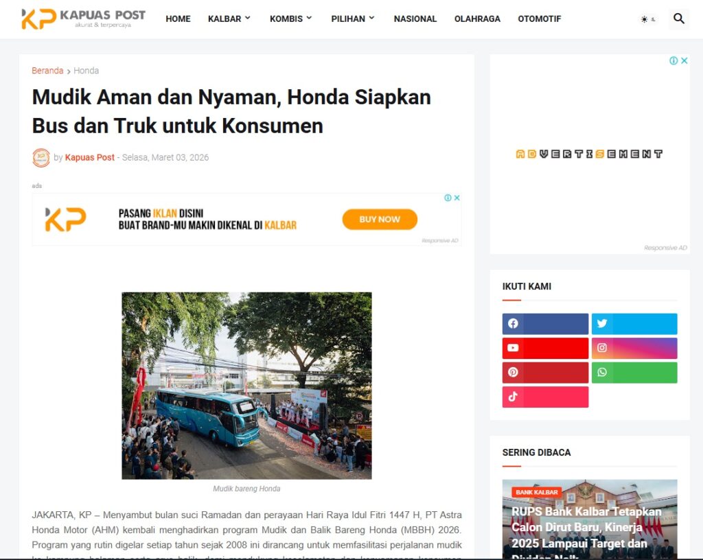 Mudik Aman dan Nyaman, Honda Siapkan Bus dan Truk untuk Konsumen by Muhammad Arif 3 Maret 2026 in Silahkan kunjungi https://www.kapuaspost.web.id/2026/03/mudik-aman-dan-nyaman-honda-siapkan-bus.html. Tags: astra Astra Motor kalbar Astra Motor Pontianak astramotor honda kalbar pontianak sepeda motor You Might Like Regional Public Launching New ADV160 The SUV Pride Grand Launching New PCX 160 Truly Exceptional! Tetap hati-hati ya bro sist berkendara saat hujan.