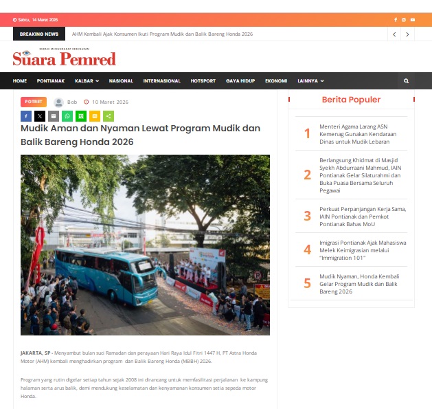 Mudik Aman dan Nyaman Lewat Program Mudik dan Balik Bareng Honda 2026 by masmul 10 Maret 2026 in Silahkan kunjungi https://www.suarapemredkalbar.com/read/potret/10032026/mudik-aman-dan-nyaman-lewat-program-mudik-dan-balik-bareng-honda-2026. You Might Like Regional Public Launching New ADV160 The SUV Pride Grand Launching New PCX 160 Truly Exceptional! Tetap hati-hati ya bro sist berkendara saat hujan.