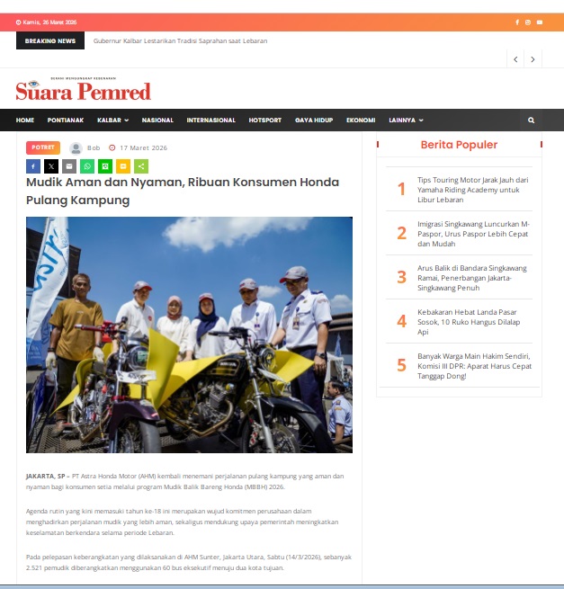 Mudik Aman dan Nyaman, Ribuan Konsumen Honda Pulang Kampung by masmul 17 Maret 2026 in Silahkan kunjungi https://www.suarapemredkalbar.com/read/potret/17032026/mudik-aman-dan-nyaman-ribuan-konsumen-honda-pulang-kampung. You Might Like Regional Public Launching New ADV160 The SUV Pride Grand Launching New PCX 160 Truly Exceptional! Tetap hati-hati ya bro sist berkendara saat hujan.