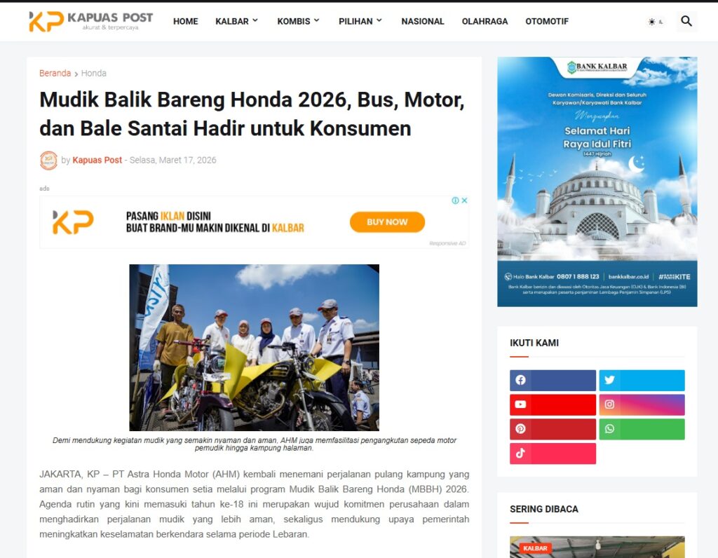 Mudik Balik Bareng Honda 2026, Bus, Motor, dan Bale Santai Hadir untuk Konsumen by Muhammad Arif 17 Maret 2026 in Silahkan kunjungi https://www.kapuaspost.web.id/2026/03/mudik-balik-bareng-honda-2026-bus-motor.html. Tags: astra Astra Motor kalbar Astra Motor Pontianak astramotor honda kalbar pontianak sepeda motor You Might Like Regional Public Launching New ADV160 The SUV Pride Grand Launching New PCX 160 Truly Exceptional! Tetap hati-hati ya bro sist berkendara saat hujan.