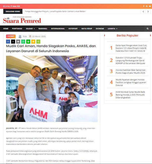 Mudik Cari Aman, Honda Siagakan Posko, AHASS, dan Layanan Darurat di Seluruh Indonesia by masmul 23 Maret 2026 in Silahkan kunjungi https://www.suarapemredkalbar.com/read/potret/23032026/mudik-cari-aman-honda-siagakan-posko-ahass-dan-layanan-darurat-di-seluruh-indonesia. You Might Like Regional Public Launching New ADV160 The SUV Pride Grand Launching New PCX 160 Truly Exceptional! Tetap hati-hati ya bro sist berkendara saat hujan.