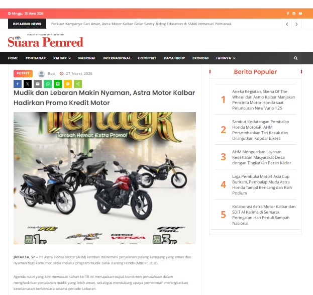 Mudik dan Lebaran Makin Nyaman, Astra Motor Kalbar Hadirkan Promo Kredit Motor by masmul 27 Maret 2026 in Silahkan kunjungi https://www.suarapemredkalbar.com/read/potret/27032026/mudik-dan-lebaran-makin-nyaman-astra-motor-kalbar-hadirkan-promo-kredit-motor. You Might Like Regional Public Launching New ADV160 The SUV Pride Grand Launching New PCX 160 Truly Exceptional! Tetap hati-hati ya bro sist berkendara saat hujan.