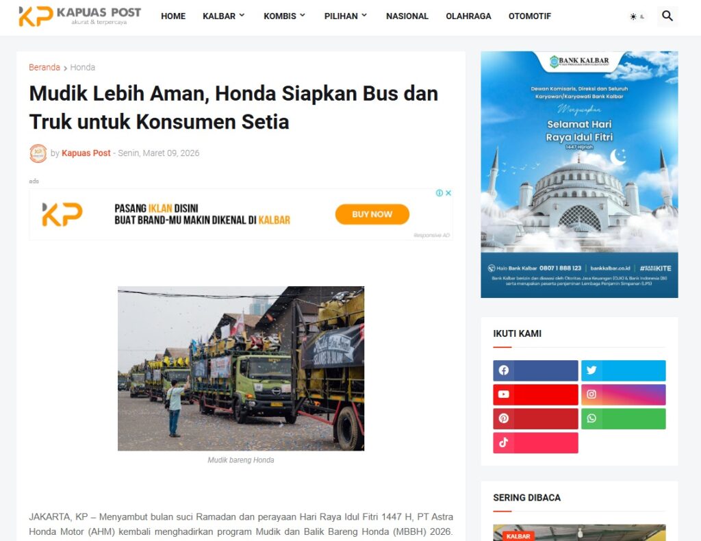Mudik Lebih Aman, Honda Siapkan Bus dan Truk untuk Konsumen Setia by Muhammad Arif 9 Maret 2026 in Silahkan kunjungi https://www.kapuaspost.web.id/2026/03/mudik-lebih-aman-honda-siapkan-bus-dan.html. Tags: astra Astra Motor kalbar Astra Motor Pontianak astramotor honda kalbar pontianak sepeda motor You Might Like Regional Public Launching New ADV160 The SUV Pride Grand Launching New PCX 160 Truly Exceptional! Tetap hati-hati ya bro sist berkendara saat hujan.