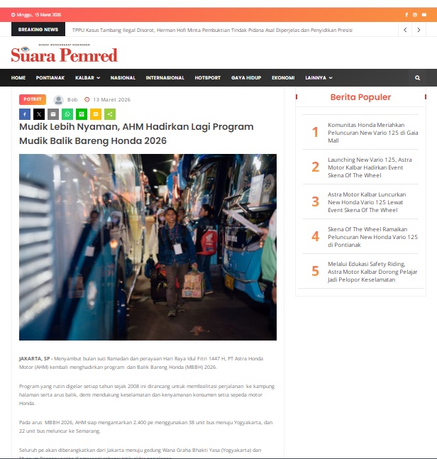 Mudik Lebih Nyaman, AHM Hadirkan Lagi Program Mudik Balik Bareng Honda 2026 by masmul 13 Maret 2026 in Silahkan kunjungi https://www.suarapemredkalbar.com/read/potret/13032026/mudik-lebih-nyaman-ahm-hadirkan-lagi-program-mudik-balik-bareng-honda-2026. You Might Like Regional Public Launching New ADV160 The SUV Pride Grand Launching New PCX 160 Truly Exceptional! Tetap hati-hati ya bro sist berkendara saat hujan.