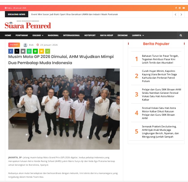 Musim Moto GP 2026 Dimulai, AHM Wujudkan Mimpi Dua Pembalap Muda Indonesia by masmul 23 Januari 2026 in Silahkan kunjungi https://www.suarapemredkalbar.com/read/potret/23012026/musim-moto-gp-2026-dimulai-ahm-wujudkan-mimpi-dua-pembalap-muda-indonesia. You Might Like Regional Public Launching New ADV160 The SUV Pride Grand Launching New PCX 160 Truly Exceptional! Tetap hati-hati ya bro sist berkendara saat hujan.
