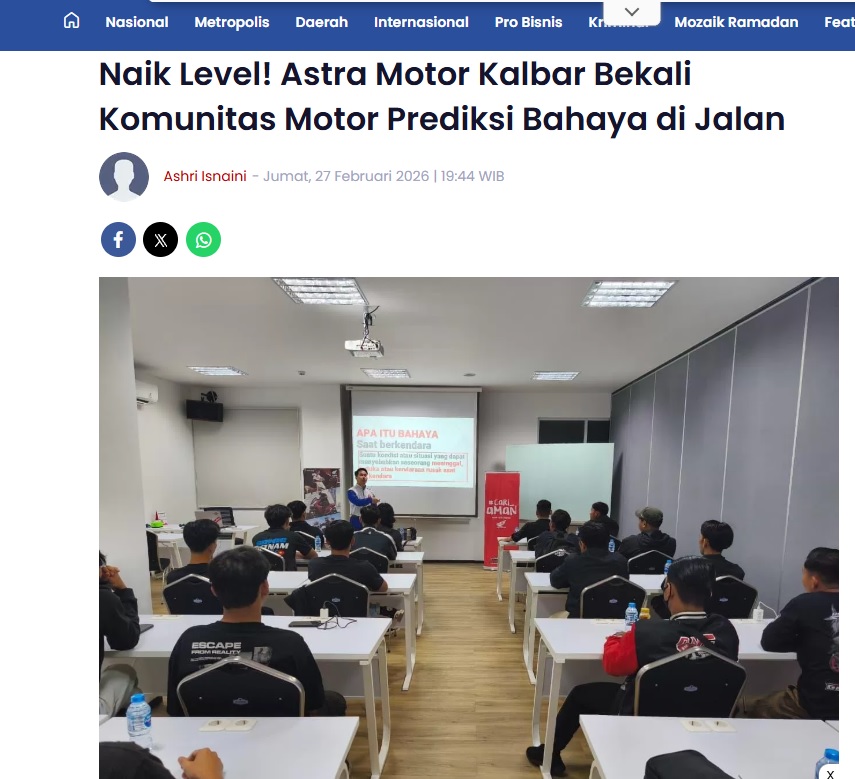 Naik Level! Astra Motor Kalbar Bekali Komunitas Motor Prediksi Bahaya di Jalan by Aristono Edi Kiswantoro 27 Februari 2026 in Silahkan kunjungi https://pontianakpost.jawapos.com/otomotif/1467251207/naik-level-astra-motor-kalbar-bekali-komunitas-motor-prediksi-bahaya-di-jalan#google_vignette. You Might Like Regional Public Launching New ADV160 The SUV Pride Grand Launching New PCX 160 Truly Exceptional! Tetap hati-hati ya bro sist berkendara saat hujan.