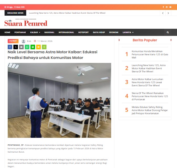 Naik Level Bersama Astra Motor Kalbar: Edukasi Prediksi Bahaya untuk Komunitas Motor by masmul 11 Maret 2026 in Silahkan kunjungi https://www.suarapemredkalbar.com/read/potret/11032026/naik-level-bersama-astra-motor-kalbar-edukasi-prediksi-bahaya-untuk-komunitas-motor. You Might Like Regional Public Launching New ADV160 The SUV Pride Grand Launching New PCX 160 Truly Exceptional! Tetap hati-hati ya bro sist berkendara saat hujan.