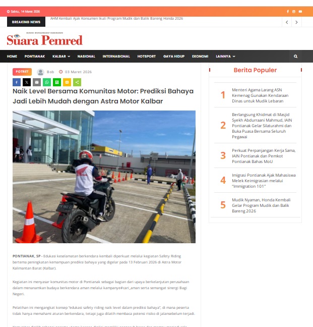 Naik Level Bersama Komunitas Motor: Prediksi Bahaya Jadi Lebih Mudah dengan Astra Motor Kalbar by masmul 3 Maret 2026 in Silahkan kunjungi https://www.suarapemredkalbar.com/read/potret/03032026/naik-level-bersama-komunitas-motor-prediksi-bahaya-jadi-lebih-mudah-dengan-astra-motor-kalbar. You Might Like Regional Public Launching New ADV160 The SUV Pride Grand Launching New PCX 160 Truly Exceptional! Tetap hati-hati ya bro sist berkendara saat hujan.