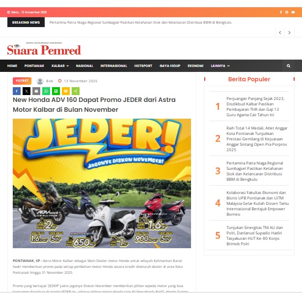 New Honda ADV 160 Dapat Promo JEDER dari Astra Motor Kalbar di Bulan November by masmul 13 November 2025 in Silahkan kunjungi https://www.suarapemredkalbar.com/read/potret/13112025/new-honda-adv-160-dapat-promo-jeder-dari-astra-motor-kalbar-di-bulan-november. You Might Like Regional Public Launching New ADV160 The SUV Pride Grand Launching New PCX 160 Truly Exceptional! Tetap hati-hati ya bro sist berkendara saat hujan.