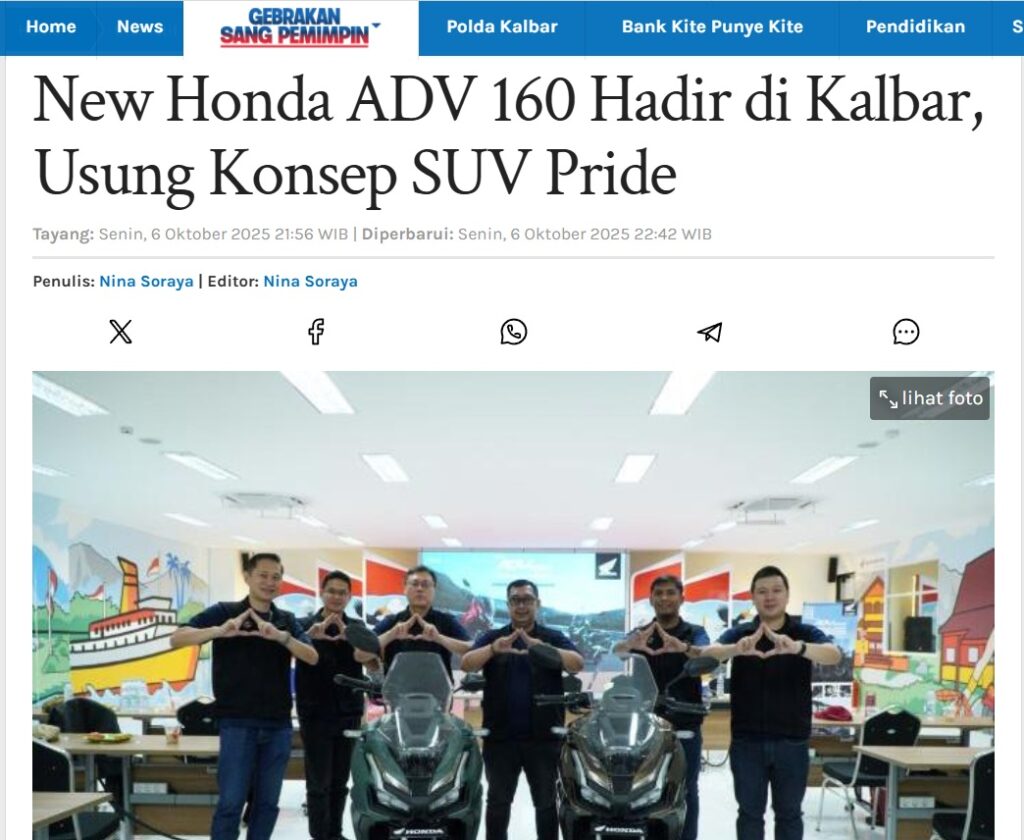 New Honda ADV 160 Hadir di Kalbar, Usung Konsep SUV Pride by Ishak Ismail 6 Oktober 2025 in Silahkan kunjungi https://pontianak.tribunnews.com/otomotif/1144629/new-honda-adv-160-hadir-di-kalbar-usun-konsep-suv-pride. You Might Like Regional Public Launching New ADV160 The SUV Pride Grand Launching New PCX 160 Truly Exceptional! Tetap hati-hati ya bro sist berkendara saat hujan.