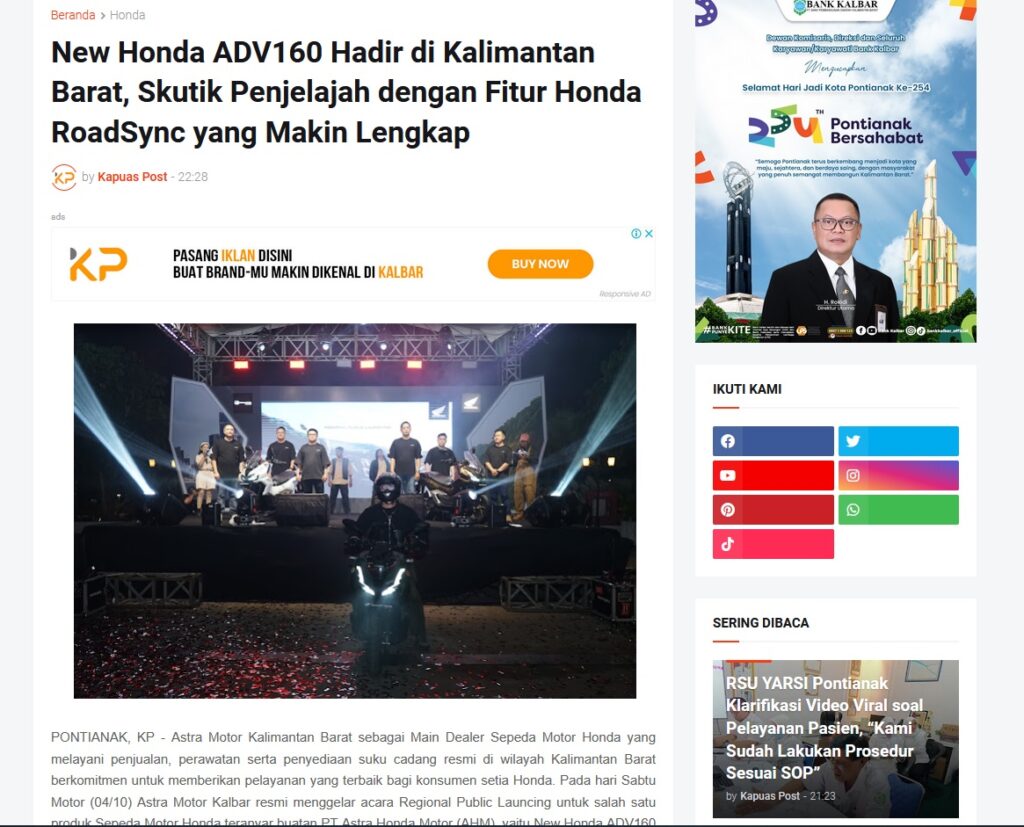 New Honda ADV160 Hadir di Kalimantan Barat, Skutik Penjelajah dengan Fitur Honda RoadSync yang Makin Lengkap by Muhammad Arif 9 Oktober 2025 in Silahkan kunjungi https://www.kapuaspost.web.id/2025/10/new-honda-adv160-hadir-di-kalimantan_23.html. Tags: astra Astra Motor kalbar Astra Motor Pontianak astramotor honda kalbar pontianak sepeda motor You Might Like Regional Public Launching New ADV160 The SUV Pride Grand Launching New PCX 160 Truly Exceptional! Tetap hati-hati ya bro sist berkendara saat hujan.