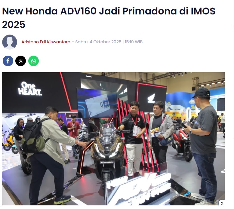New Honda ADV160 Jadi Primadona di IMOS 2025 by Aristono Edi Kiswantoro 4 Oktober 2025 in Silahkan kunjungi https://pontianakpost.jawapos.com/pro-bisnis/1466659176/new-honda-adv160-jadi-primadona-di-imos-2025. You Might Like Regional Public Launching New ADV160 The SUV Pride Grand Launching New PCX 160 Truly Exceptional! Tetap hati-hati ya bro sist berkendara saat hujan.